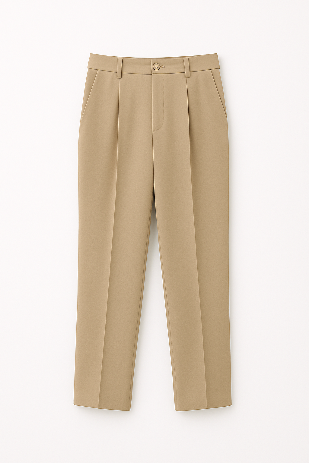 A pair of beige tailored trousers displayed in a clean, front-facing product shot against a white background. The trousers feature a refined, minimalist silhouette with a flat front, subtle pleats near the waistband, and neatly pressed front creases that run down the legs. They include a single button closure, belt loops, and discreet side pockets. The smooth, structured fabric and warm neutral tone give the pants a polished, versatile look suitable for both formal and elevated casual outfits.