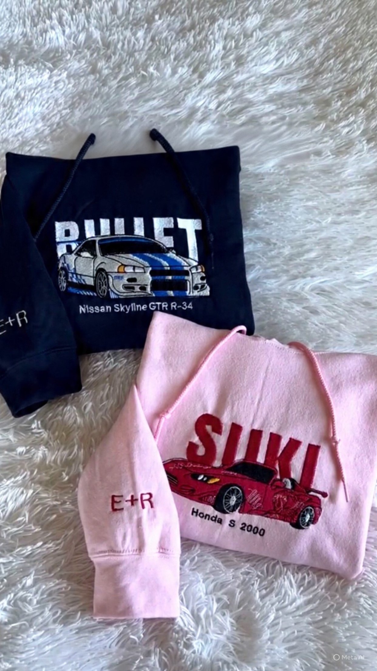 Designed for true car lovers, these hoodies combine streetwear comfort with iconic JDM culture. Each piece features a detailed embroidered sports car graphic inspired by legendary Japanese performance cars. The black hoodie showcases the “Bullet” Nissan Skyline GTR R-34, while the soft pink hoodie highlights the bold “Suki” Honda S2000, creating a striking contrast of power and style.